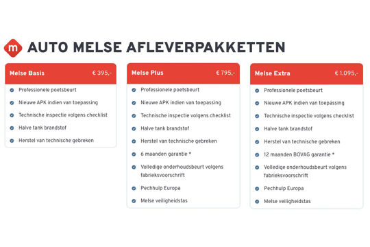 Het afleverpakket Extra omvat een volledige onderhoudsbeurt volgens het fabrieksonderhoudsschema en een nieuwe APK-keuring. Bovendien krijgt u 12 maanden BOVAG- garantie, Pechhulp Europa, een volledige poetsbeurt en brandstof tussen 1/4 en 1/2 tank.
